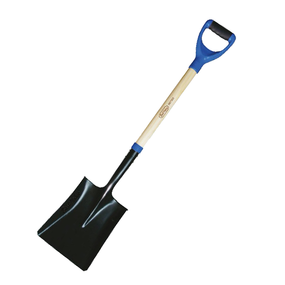 Mango de madera barnizado de 30” (75 cm). Maneral plástico en “D” metal esmaltado contra óxido, templado a una dureza de 46RC.